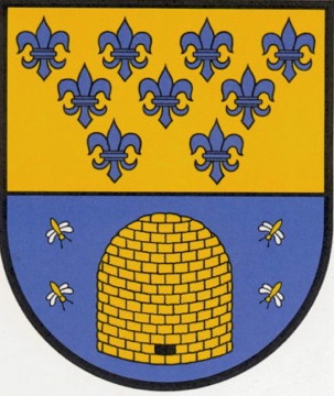 „Das Wappen enthält im geteilten Schilde oben in Gold neun blaue Lilien, unten in Blau einen goldenen Bienenkorb, begleitet von vier einfliegenden Bienen (Immen). Immendorf gehörte zur